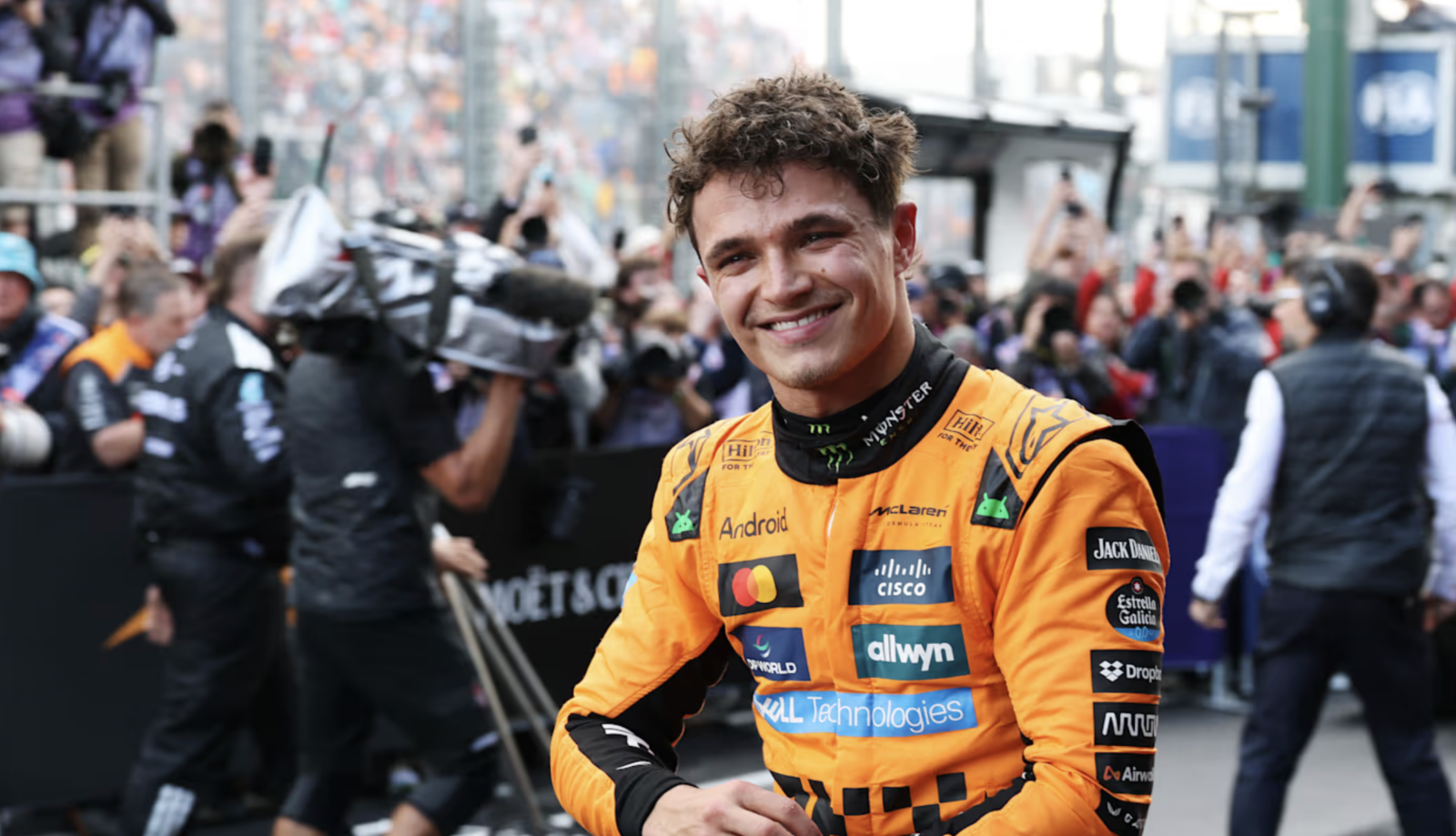 En la vuelta 45, un error de Lando Norris y Oscar Piastri permitió que Verstappen tomara la delantera momentáneamente, pero la lluvia obligó al neerlandés a hacer una parada extra en pits. Esta situación fue aprovechada por Norris, quien retomó la primera posición y resistió los embates finales de Verstappen para cruzar la meta en primer lugar.
