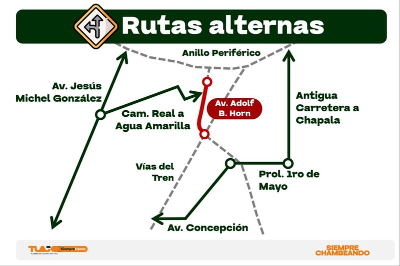 Con motivo de estas obras, se recomienda a la ciudadanía considerar las siguientes rutas alternas Avenida Jesús Michel González, Camino Real a Agua Amarilla, Avenida Concepción, Prolongación Primero de Mayo y Antigua Carretera a Chapala.