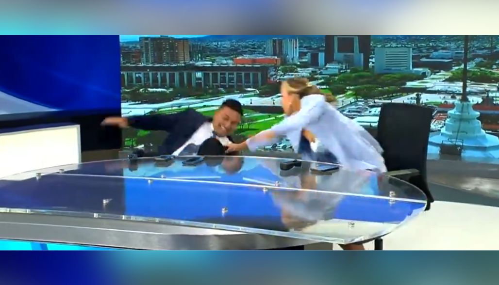 ¡AL SUELO! Conductor de noticiero se cae de la silla en vivo