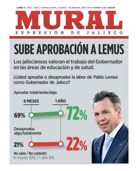 Este lunes, el diario local realizó la encuesta a jaliscienses de 20 municipios de cada distrito electoral preguntando si aprobaba o desaprobaba la labor de Pablo Lemus como gobernador; sólo 22 por ciento lo desaprobó, un seis por ciento contestó que no sabía o no quiso contestar y el 72 por ciento lo avaló.