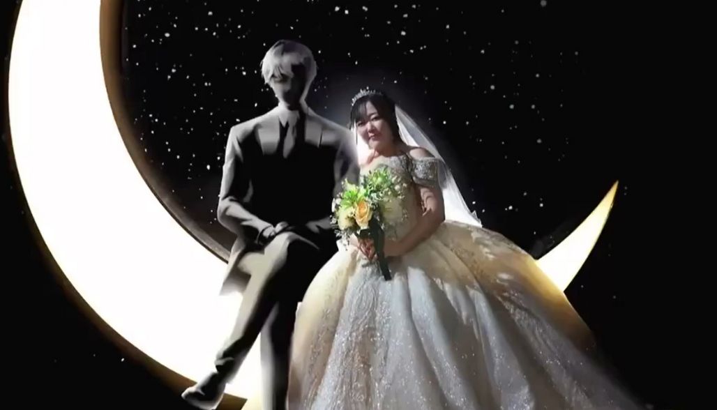En redes sociales se ha viralizado el video donde aparece con su vestido de novia, en un templo y un aparato con el que puede ver a su pareja virtual.