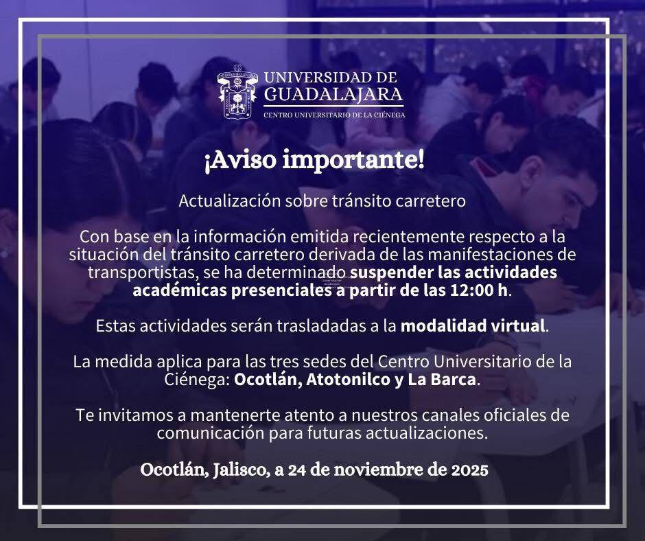 La Universidad de Guadalajara anunció la suspensión de clases en los Centros Universitarios de Ocotlán, Atotonilco y La Barca por los bloqueos carreteros desde las 12:00 horas.
