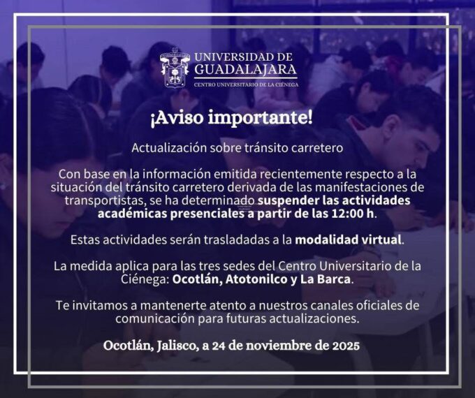 PorRedacción26/11/2025La Universidad de Guadalajara anunció la suspensión de clases en los Centros Universitarios de Ocotlán, Atotonilco y La Barca por los bloqueos carreteros...